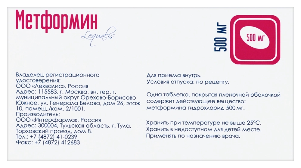 МЕТФОРМИН 500мг N60 табл п.п.о. ИНТЕРФАРМА