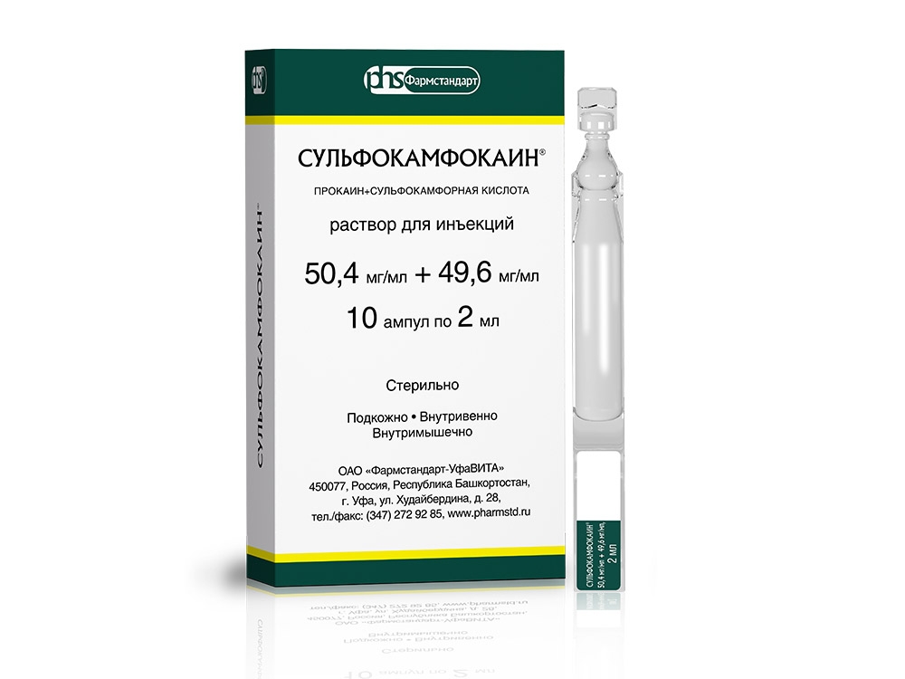 СУЛЬФОКАМФОКАИН 50.4мг/мл+49.6мг/мл x 2мл N10 р-р д/инъекц ФАРМСТАНДАРТ-УФАВИТА